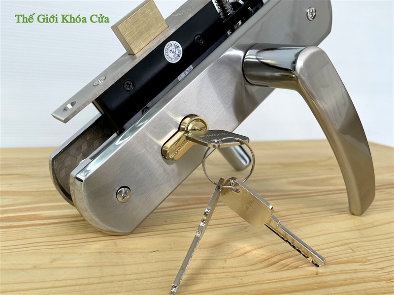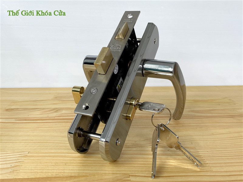 Thân khóa được sản xuất bằng tôn thép với độ dày 1,5mm, được phủ một lớp sơn tĩnh điện. Then khóa làm bằng đồng vàng (đồng thau) có kết cấu chắc chắn, an toàn. Tất cả chi tiết khác bên trong thân khóa được làm bằng tôn thép mạ Zn theo tiêu chuẩn quốc tế.