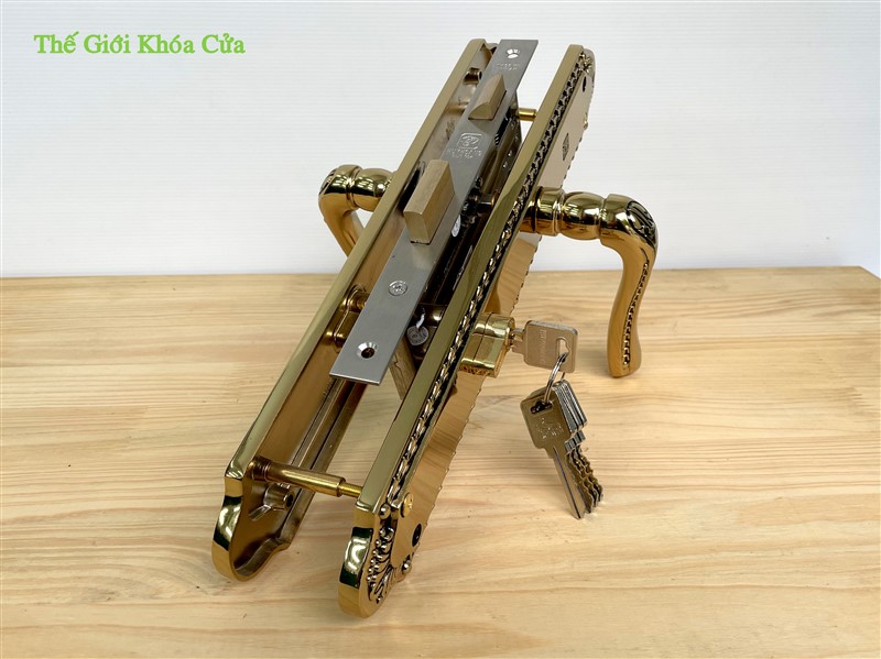 Ổ khóa làm bằng đồng vàng (đồng thau), sử dụng chìa vi tính tránh bị trùng chìa, dò chìa, rất an toàn. Ngoài ra có thể thay thế bằng Ổ khóa Huy Hoàng - Abus, một sản phẩm của sự kết hợp của Khóa Huy Hoàng và tập đoàn Abus từ CHLB Đức (Tập đoàn Abus là tập đoàn số 1 thế giới về các sản phẩm trong lĩnh vực an toàn)