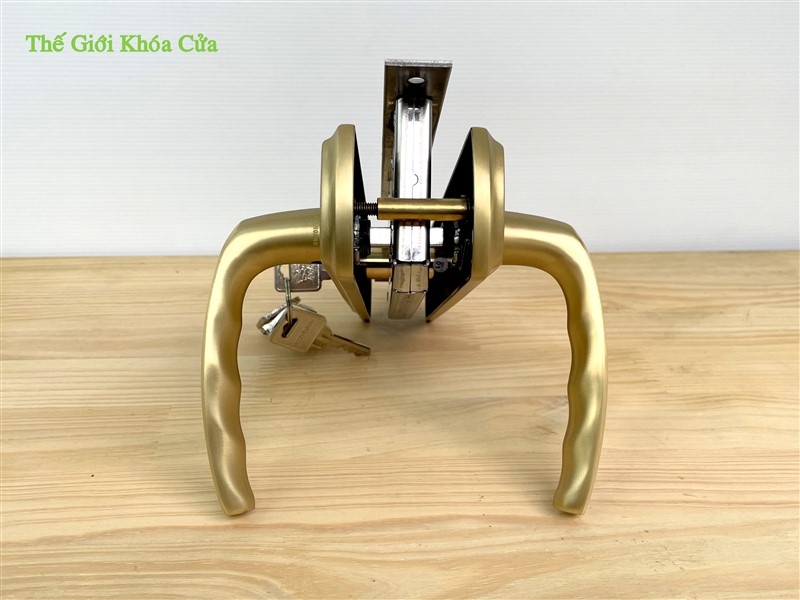Tay ốp khóa sản xuất bằng vật liệu đồng vàng (đồng thau) tạo xước bề mặt giúp sản phẩm thêm phần ấn tượng