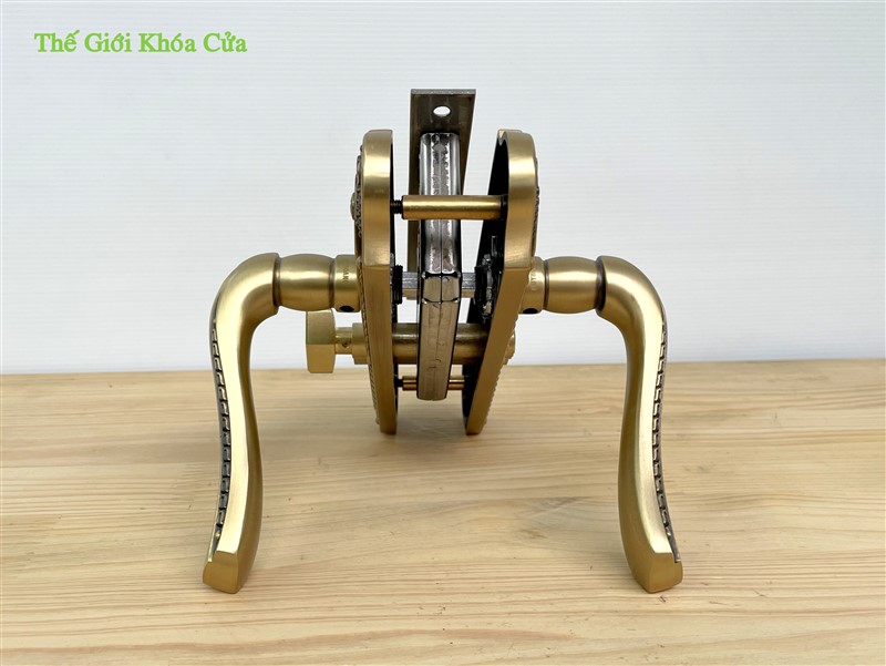 Tay ốp khóa sản xuất bằng vật liệu đồng vàng (đồng thau) tạo xước bề mặt giúp sản phẩm thêm phần ấn tượng