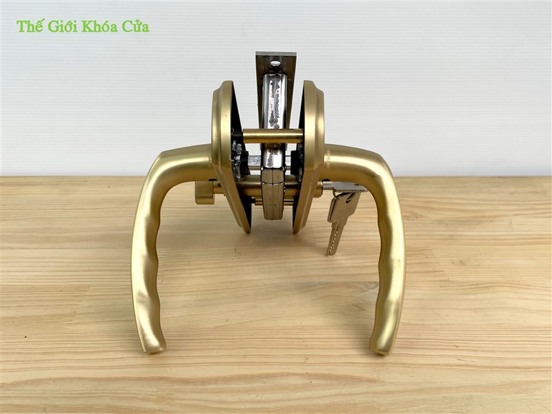 Tay ốp khóa sản xuất bằng vật liệu đồng vàng (đồng thau) tạo xước bề mặt giúp sản phẩm thêm phần ấn tượng