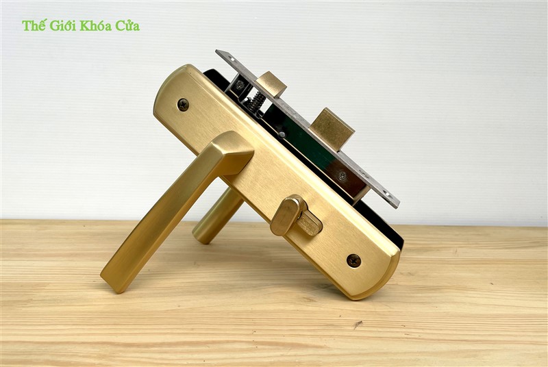 Tay ốp khóa sản xuất bằng vật liệu đồng vàng (đồng thau) tạo xước bề mặt giúp sản phẩm thêm phần ấn tượng