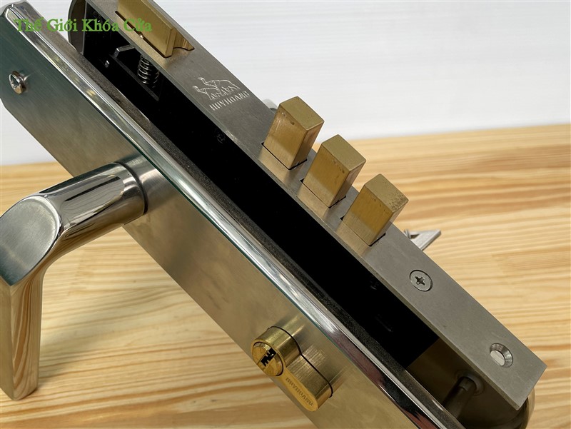 Ổ khóa làm bằng đồng vàng (đồng thau), được thiết kế chìa vi tính ( 7 bi ) tránh bị trùng chìa, rất an toàn. Ngoài ra có thể thay thế bằng Ổ khóa Huy Hoàng - Abus, một sản phẩm của sự kết hợp của Khóa Huy Hoàng và tập đoàn Abus từ CHLB Đức (Tập đoàn Abus là tập đoàn số 1 thế giới về các sản phẩm trong lĩnh vực an toàn).